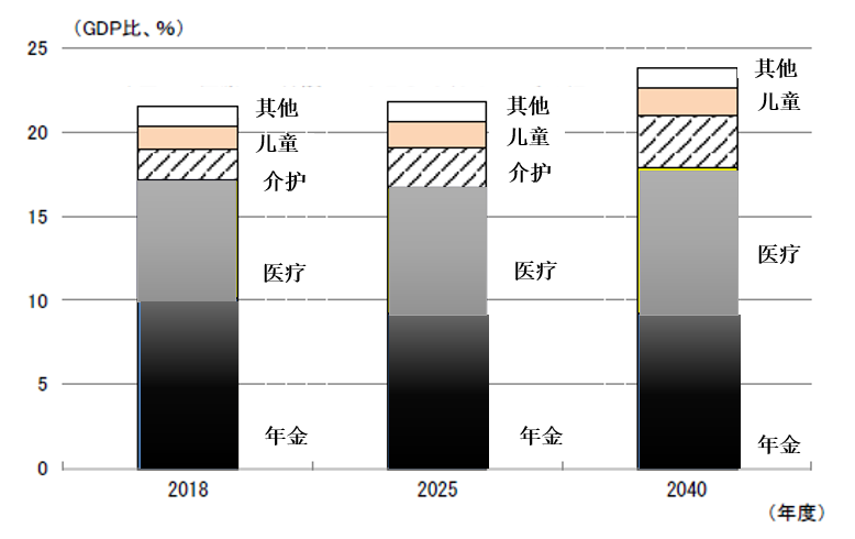 图3是2018年、2025年以及2040年社会保障給付費收入现状以及此后预测。如图3所示,2018年社会保障给付费为121。3兆日元,占P的21。5%,此中年金给付56。7兆日元,。医疗安全给付39。2兆日元,占P7。0%。占P1。9%,包罗儿童、残疾人福利等的其它部门14。6兆日元,占P2。6%。进入2025年当前,社会保障給付費所占P比例取2018年比拟将添加1。14倍,此中,年金给付费添加1。1倍、医疗给付费添加1。2倍,介护给付费添加1。4倍;进入2040年当前,社会保障給付进一步增加,取2025年比拟添加1。22倍,年金给付费添加1。2倍;医疗给付费1。4倍,介护给付费添加1。7倍。 此中,其次为医疗给付,年金给付费增加速度减缓。