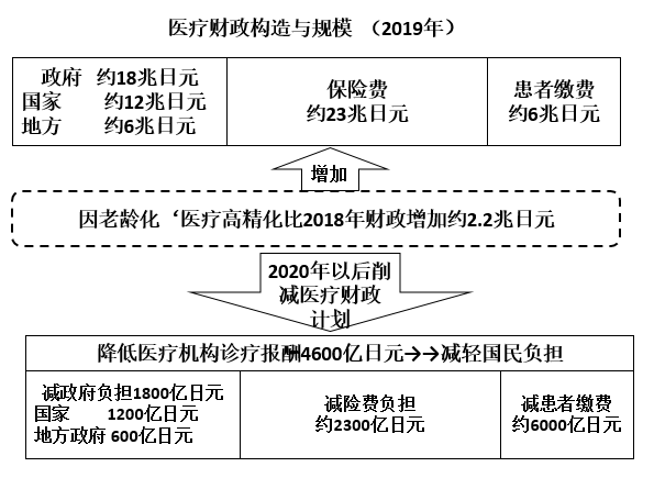本文对日本医疗保障财务构制,规模,医疗费出入情况以及小我承担医疗费情况进行评述。同时对医疗安全收入正在社会保障各项收入中所占地位进行预测阐发。医疗安全轨制财路由三部门形成,即财务投入(又称公费)、医疗安全费、诊疗费收入等。财务包罗地方财务和处所财务,来自于国度税和处所税,次要用于公费承担医疗轨制、后期高龄者医疗轨制等。医疗安全费次要包罗医疗安全、后期高龄者医疗轨制参保者缴纳的安全费、劳动灾祸弥补安全参保者缴纳的安全费等。诊疗费收入次要是患者领取的医疗费。2019年的医疗财务预算形成如图1 所示:医疗财务总预算为46兆日元,财务承担18兆日元,此中地方承担12兆日元,处所6兆日元。安全费收入23兆日元,患者承担诊疗收入等6兆日元。因为老龄化和医疗手艺前进带来的医疗费总额以每年1。1兆日元的速度增加,增加的部门被均派到财务收入和患者小我医疗费承担里边。财务承担所添加的收入,次要依托提高消费税和其它名目标税收填补,患者小我承担部门则通过提高诊疗和医治以及医药费收费尺度填补。好比图1中显示出2019年患者承担每年以1。1兆日元的速度增加,取医疗费增加总额同步。为了减轻由公费承担的财务压力,近年的沉点是提高患者小我承担比例来填补医疗安全赤字。
